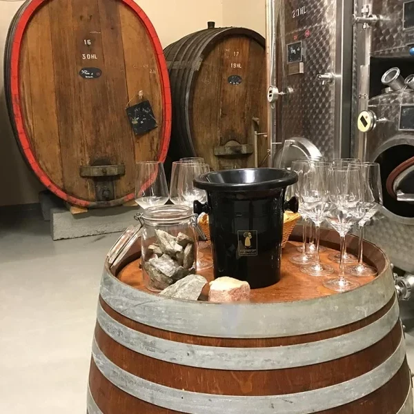 Accueil au caveau, où nous commencerons la dégustation de nos vins. La visite se poursuit ensuite à la cave familiale datant de 1850, pour découvrir les fûts de chêne centenaires, qui sont toujours utilisé pour vinifier les vins.
